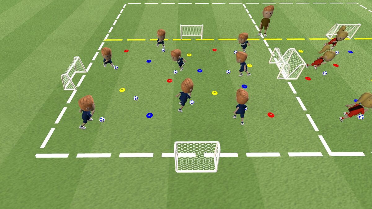 Trainingsziel: In Dribbelspielen helfen wir Kindern, den Ball eng am Fuß zu führen und Hindernissen auszuweichen. Farbaufgaben können zusätzliche kognitve Reize setzen und die Entscheidungsfindung beim Dribbeln fördern. Dribbelspiele machen den Kindern viel Spaß, wenn sie mit Anschlussaktionen (z. B. einem Torschuss) verbunden sind.